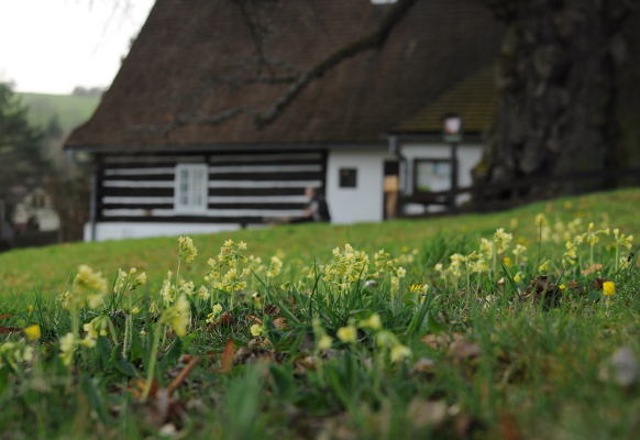 Chalupa u lípy a lípa je ten tmavý kolos vpravo. A prvosenky, samozřejmě...